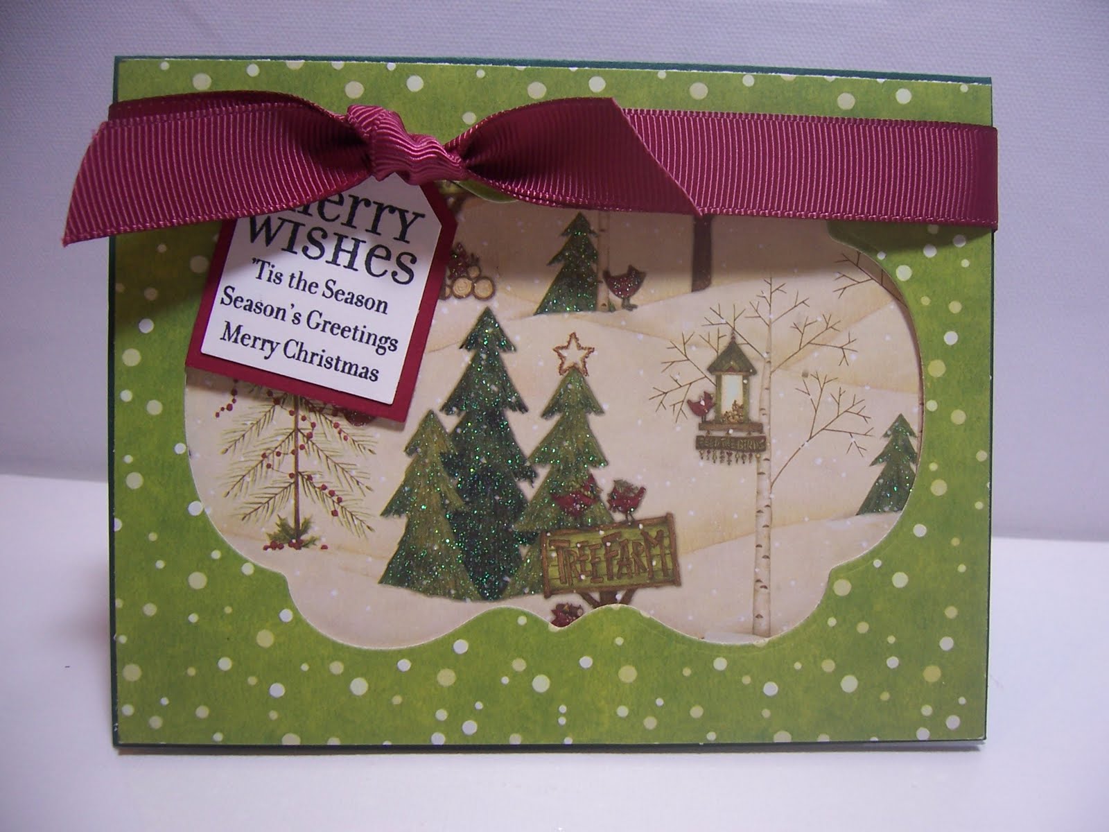 Hello all! Today is Wednesday- happy hump day! Glad you can stop in. It seems to be a long week already for me and I am not sure why. But today's card is a simple one, not much stamping and definately NO coloring. I have so much holiday paper and this is a Debbie Mum sheet and I wanted to really be able to see those sparkly trees. All I did is took the green snowy paper and cut out shape with my nesties- and then I just lifted it with 3D stickies. Added the tag and ribbon and it was done. Very simple but I like it. Hope you will stop back tomorrow!